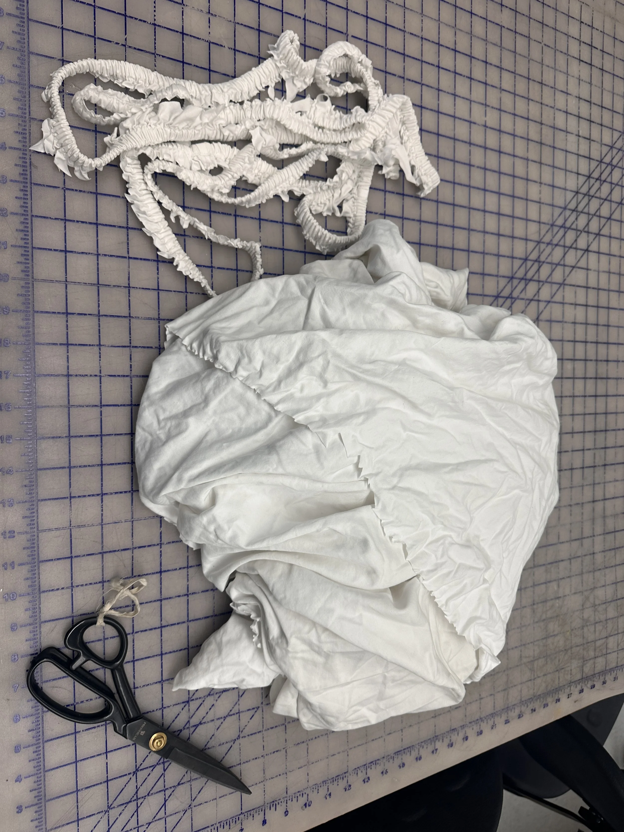 I am working with 100% cotton bedsheets passed down from family members for this project. The bodice design is inspired by a white peplum tank top from 2013 that my grandmother and I shared, a garment filled with emotional and sentimental value. I distinctly remember purchasing it together at the mall, and throughout my childhood, we often shared clothes, which deepened my appreciation for fashion. My grandmother’s influence is a significant part of why I cherish this art form, and incorporating her memory into my work is a personal tribute I strive to achieve.